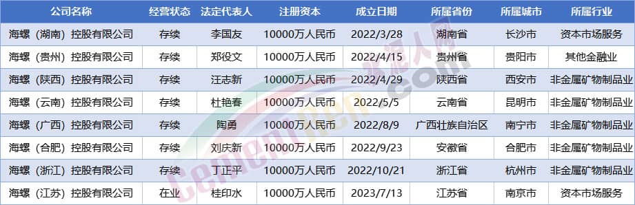 据查询,近两年,海螺水泥先后成立7家区域控股有限公司,注册资本均为1亿元。涉及湖南、贵州、陕西、云南、广西、安徽、浙江等多个省市地区,所属行业分别为资本市场服务及非金属矿物制品业。