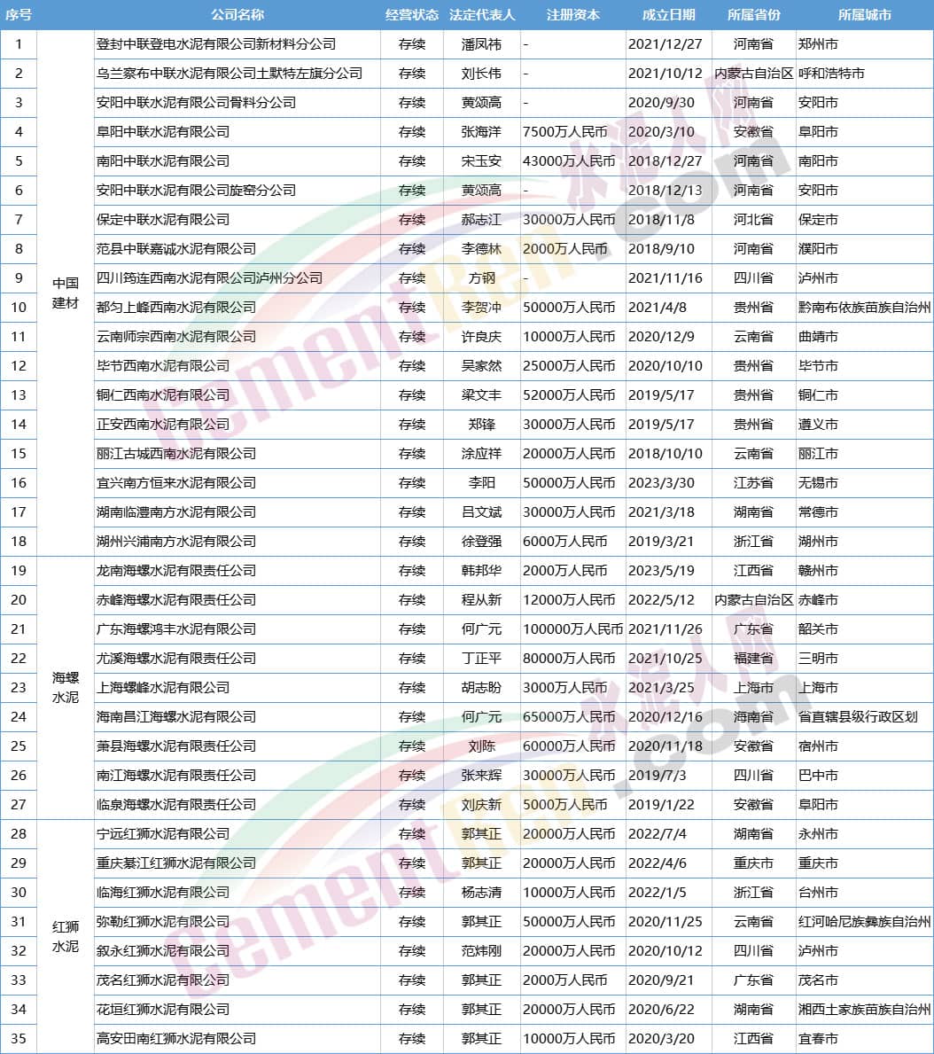 从海螺水泥、红狮水泥新成立公司涉及区域可见,赤峰海螺水泥、广东海螺鸿丰水泥、昌江海螺水泥、萧县海螺水泥、弥勒红狮水泥、叙永红狮水泥、茂名红狮水泥、花垣红狮水泥、高安田南红狮水泥等多家公司均为近年来新收购企业或新布局区域注册公司。