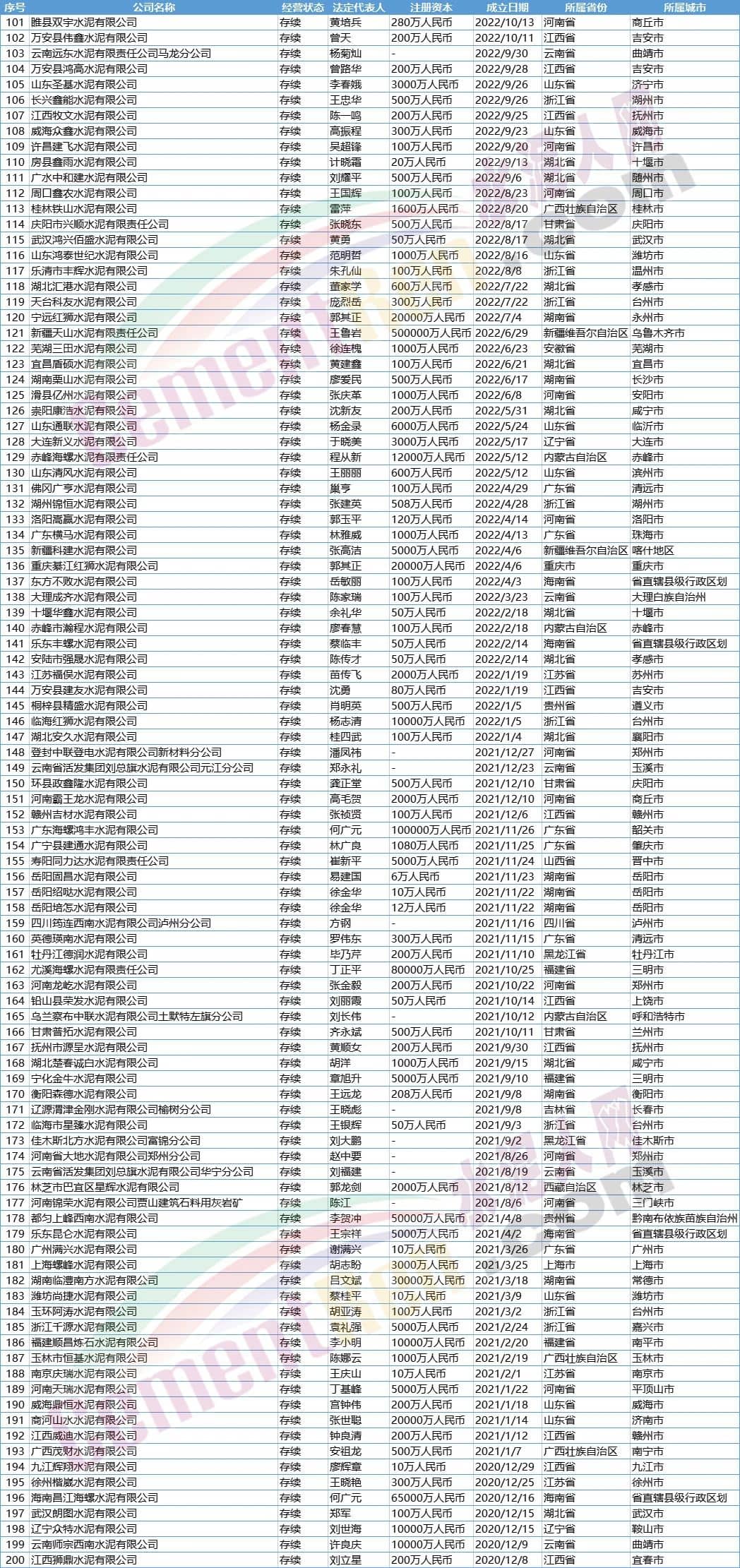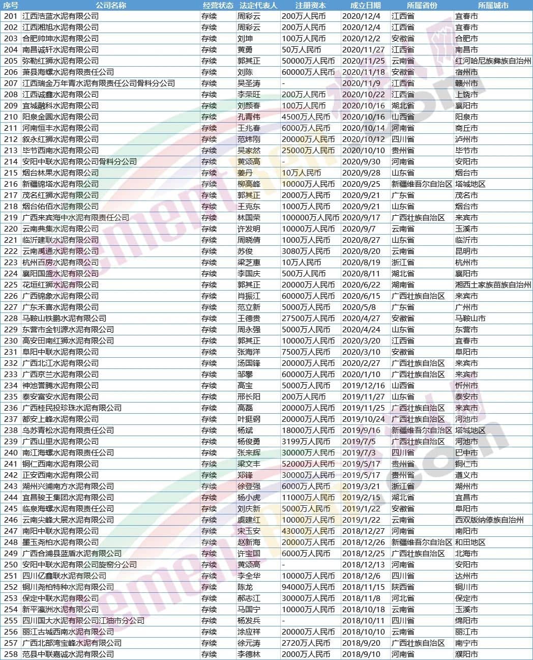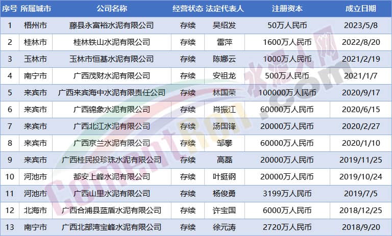 水泥人网注意到新成立企业中包含近年来新增产能较大的广西区域,新成立企业包含知名企业广西来宾海中水泥有限责任公司、广西锦象水泥有限公司、广西北江水泥有限公司、广西京兰水泥有限公司、都安上峰水泥有限公司等13家水泥公司。