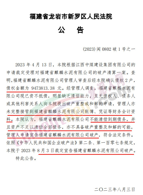 8月3日,福建省龙岩市新罗区人民法院发布公告称:2023年4月13日,根据江西中煤建设集团有限公司的申请裁定受理对福建省麒麟水泥有限公司的破产清算一案。