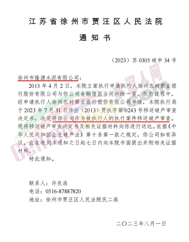 法院执行局于2023年7月31日作出(2013)贾执字第0243号移送破产审查决定书,决定将徐州市隆源水泥有限公司作为被执行人的执行案件移送破产审查。