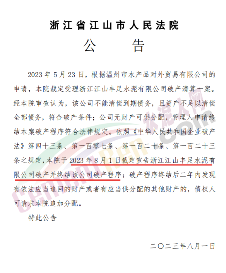 浙江江山丰足水泥有限公司破产