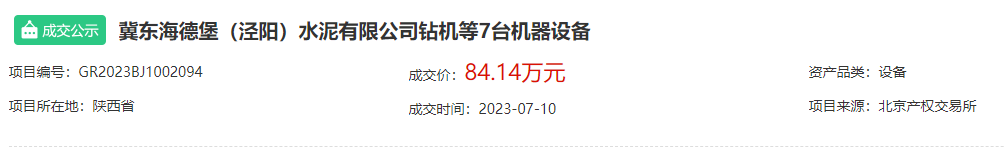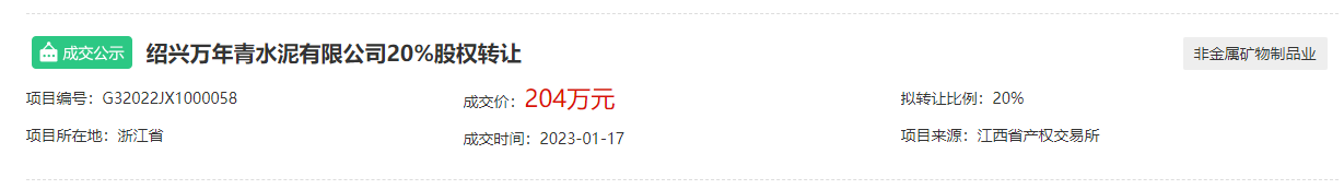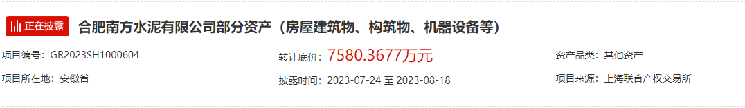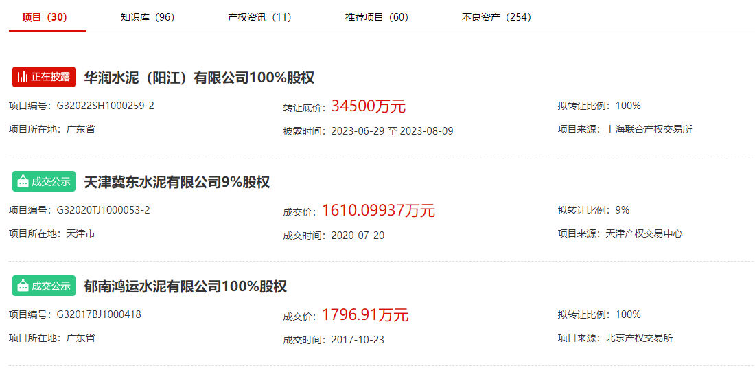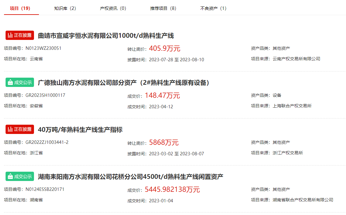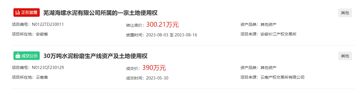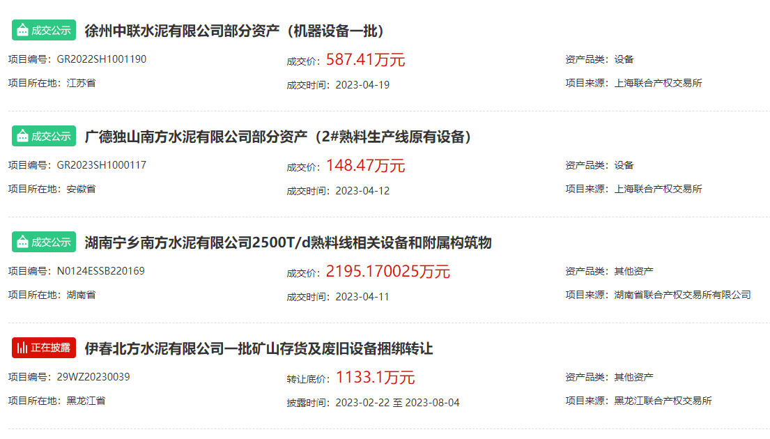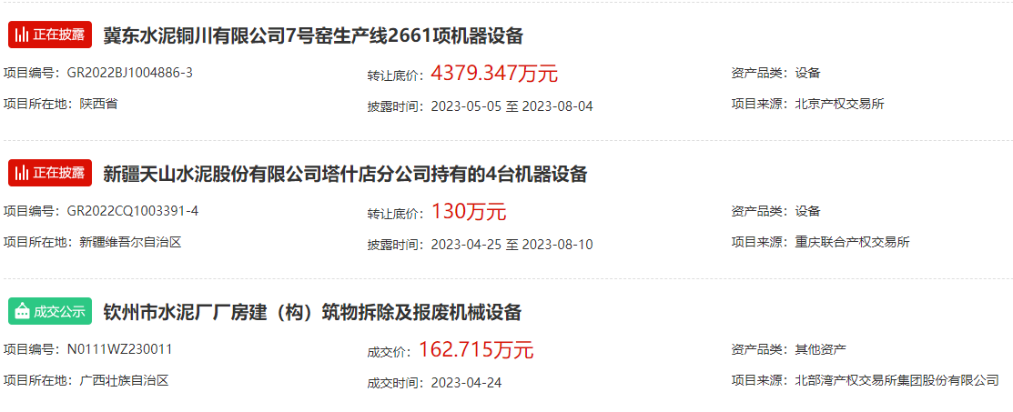 另有包含华润水泥、冀东水泥、万年青水泥在内的4家品牌企业公开出让企业股权;包含行业知名企业芜湖海螺水泥在内的两家企业公开出让土地使用权;包含天山水泥、中联水泥、南方水泥、北方水泥、冀东水泥在内的14家企业公开出让熟料生产线、熟料指标、房屋建筑物、构筑物及机器设备等资产。