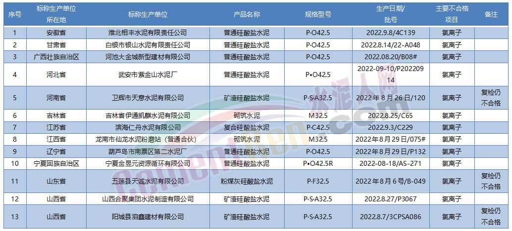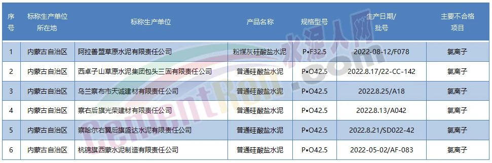 内蒙自治区5批次水泥氯离子不合格