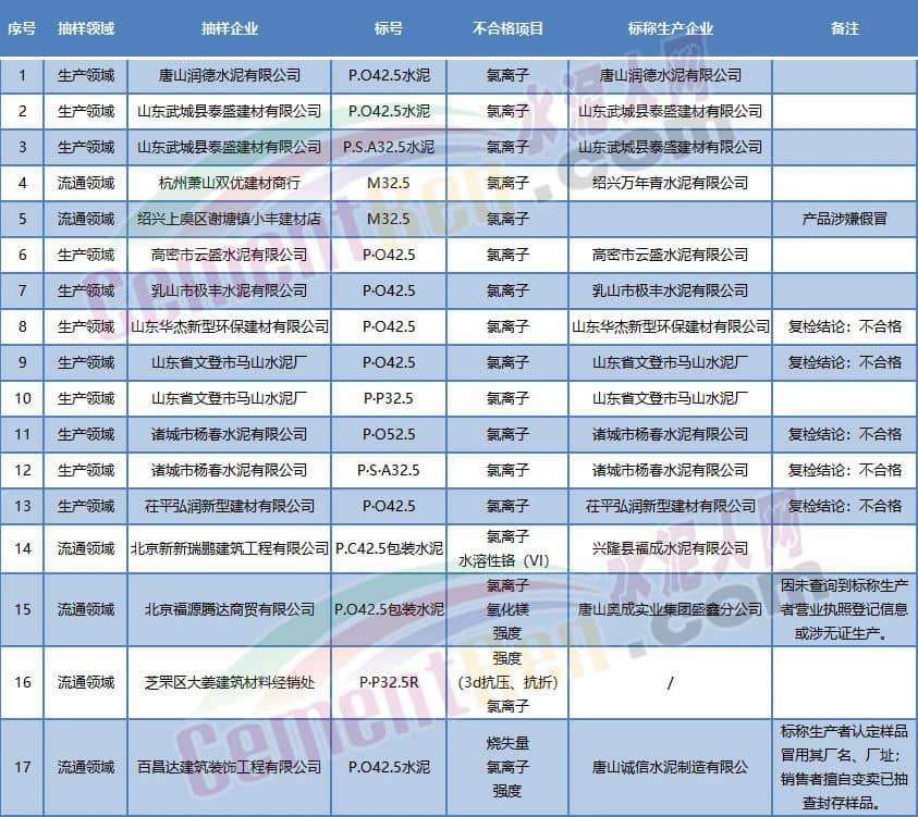 25个批次水泥产品氯离子不合格