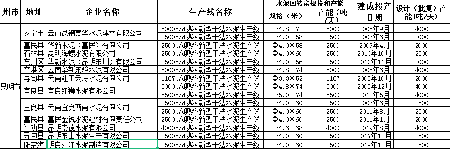 昆明地区水泥熟料企业数据(来自云南省工信厅)