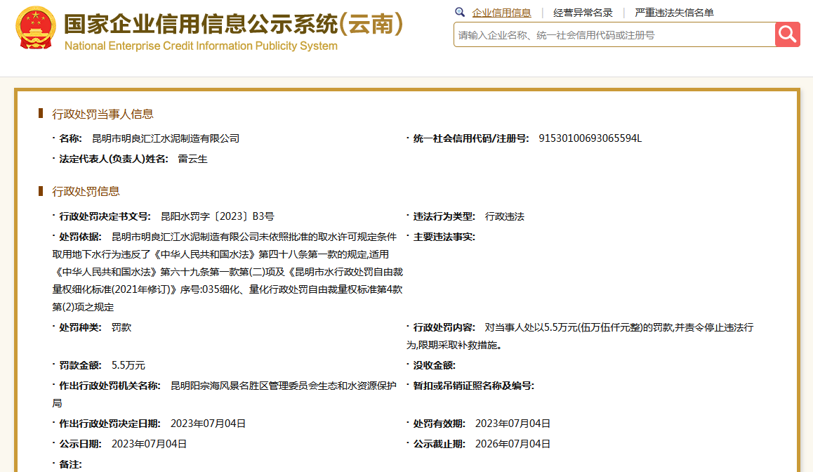 另外,根据国家企业信用信息公示系统公开信息显示,昆明市明良汇江水泥制造有限公司未依照批准的取水许可规定条件取用地下水,被昆明阳宗海风景名胜区管理委员会生态和水资源保护局处罚。
