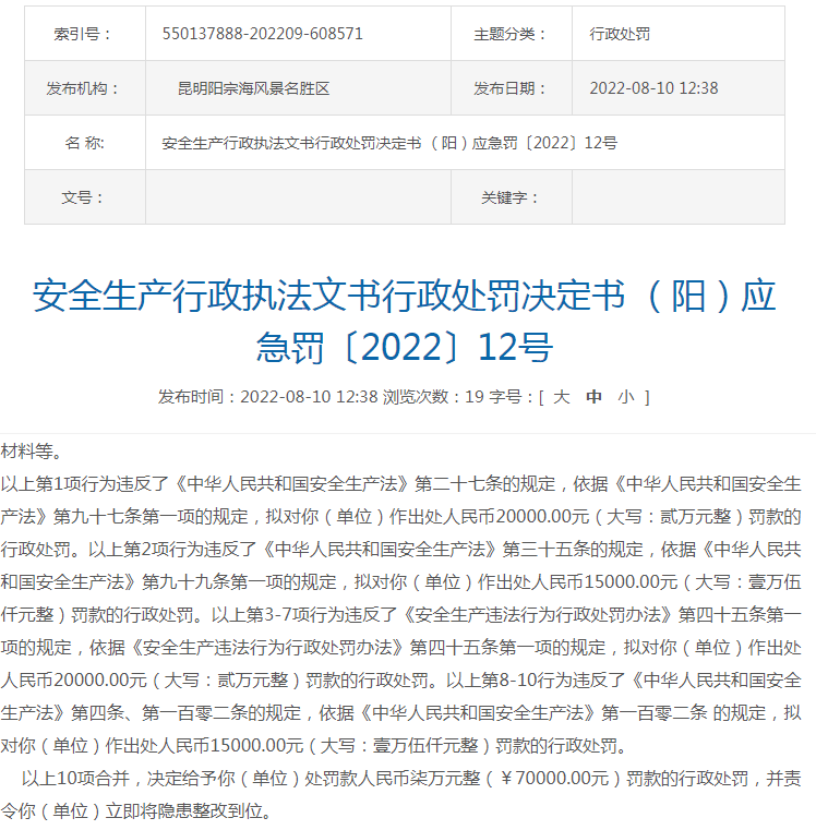 2022年8月10日,昆明阳宗海风景名胜区管理委员会发布《安全生产行政执法文书行政处罚决定书(阳)应急罚〔2022〕12号》称:昆明市明良汇江水泥制造有限公司大马山石灰岩矿在生产过程中存在未配备注册安全工程师、采矿技术员,矿山+1980m水平台阶存在凹陷,该区域未设置警示标识,矿山未编制挖掘机、装载机、推土机操作规程等违法违规行为,昆明阳宗海风景名胜区管理委员会对该水泥厂作出7万元处罚。
