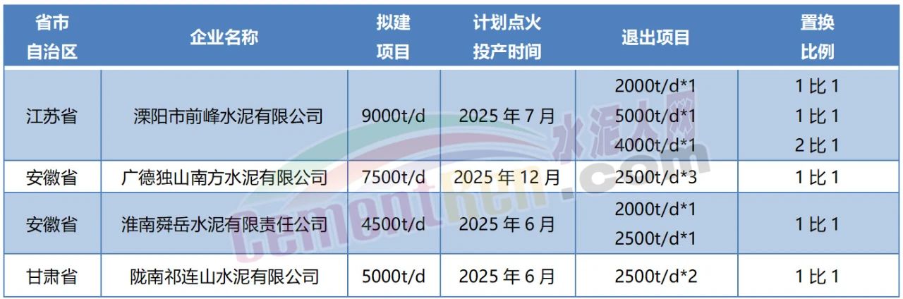 江苏工信厅2023年7月25日公告,溧阳市前峰水泥有限公司拟建一条9000t/d水泥熟料生产线,退出项目分别为江苏金峰水泥集团有限公司1条2000t/d、江苏溧阳南方水泥有限公司1条5000t/d,置换退出比例为1:1。江南-小野田水泥有限公司1条4000t/d熟料生产线,置换比例为2:1。