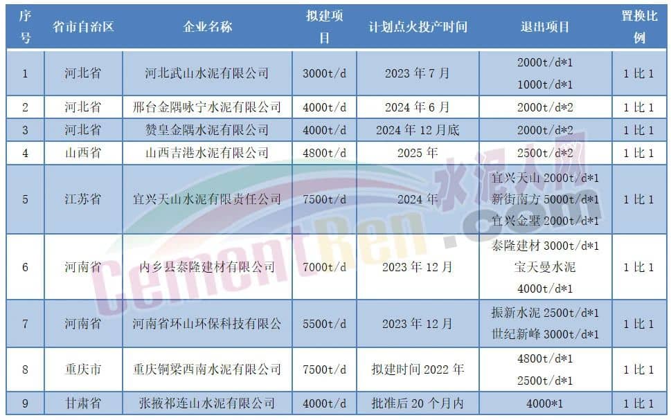 2022年公告的9个水泥熟料项目等量置换,多个项目缓建或撤销
