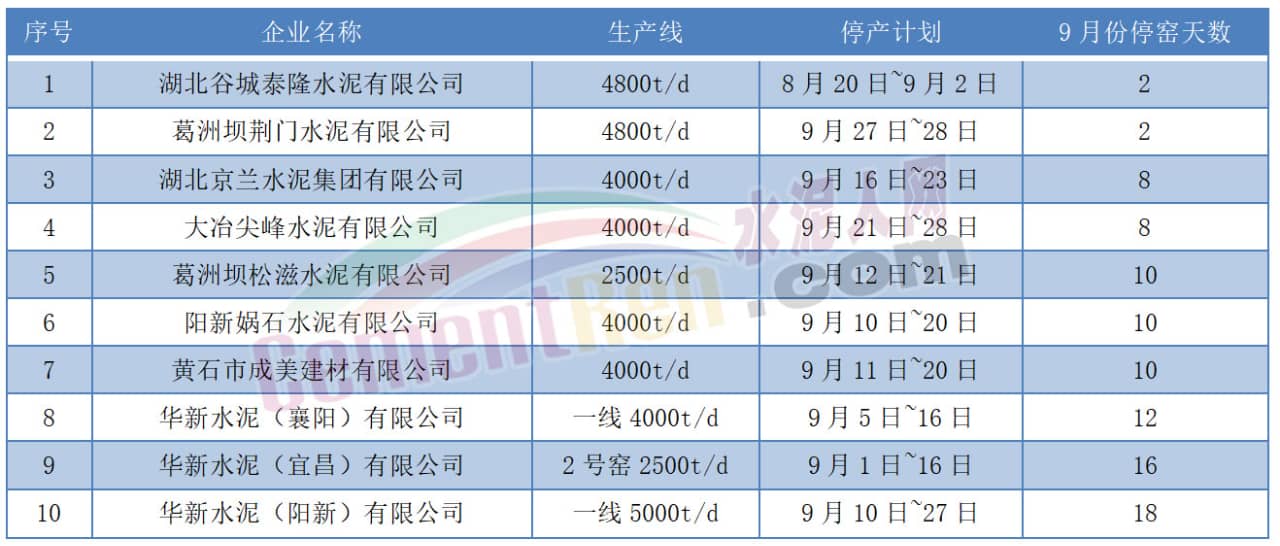 其中四川省109条熟料线9月份停窑10天以上;新疆天山水泥股份有限公司塔什店分公司因置换错峰期间开窑时间,将错峰停窑时间调整到9月1日-10月1日期间,9月份全月停窑;湖北华新水泥(阳新)有限公司一线5000t/d生产线9月10日~27日期间停窑18天;山西多个区域水泥企业9月15日~10月4日期间停窑15-19天。
