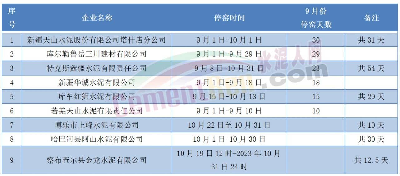 按照新疆工信厅年内发布的七批水泥企业调整错峰生产时间的公告,明确于9月内停窑的6家企业停窑时间从10天~30天不等。明确9-10月份内停窑的10家企业,最长停窑54天。