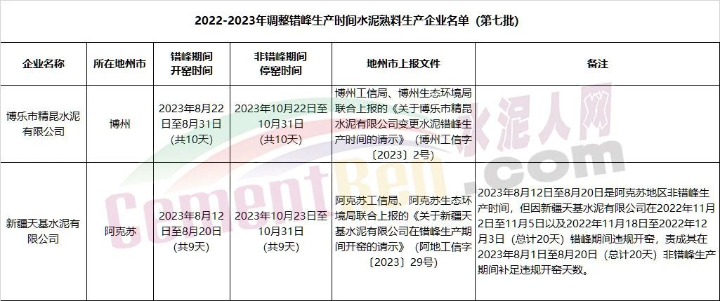 新疆工信厅近日发布的2022-2023年调整错峰生产时间水泥熟料生产企业名单(第七批)显示,博乐市精昆水泥有限公司将8月份错峰期间停窑10天置换至非错峰生产时间10月份停窑10天;新疆天基水泥有限公司将8月份停窑9天置换至10月份非错峰生产时间停窑9天。