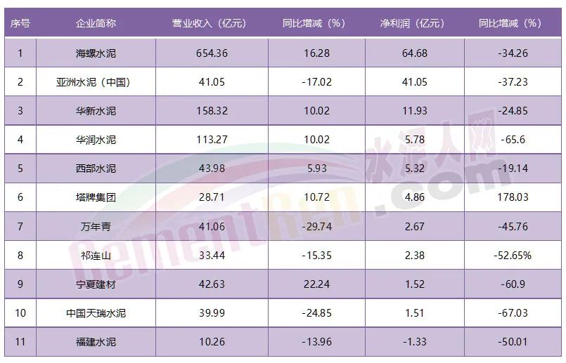 海螺水泥、亚洲水泥、华新水泥、华润水泥、西部水泥、万年青宁、祁连山、宁夏建材、天瑞水泥等9家企业净利润等均有不同程度的下滑;福建水泥亏损1.33亿。