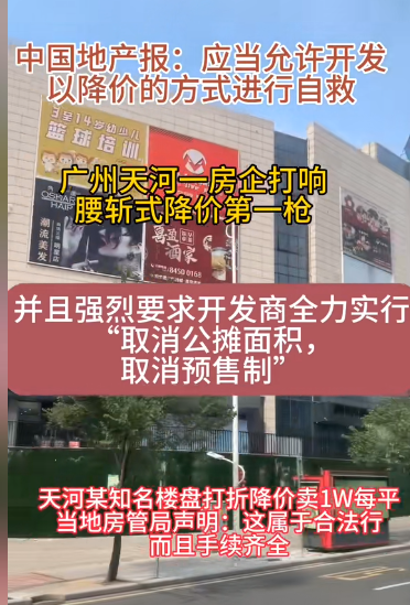 日前,广州天河一知名楼盘打折降价卖1W每平,打响“腰斩式”降价第一枪。并且强烈要求开发商全力实行取消公摊面积,取消预售制。当地房管局声明称,这属于合法行为,手续齐全。