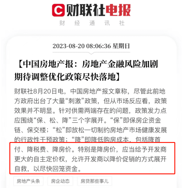 代表官方的中国房地产报发文称:房地产金融风险加剧期待调整优化政策尽快落地。其中提到最重要的一点,应当给予开发商更大的自主定价权,允许开发商以降价促销的方式展开自救,以尽快回笼资金。