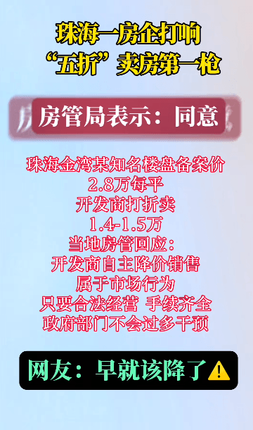 同期,珠海金湾某知名楼盘备案价2.8万,每平开发商打折卖1.4万~1.5万。当地房管回应称,开发商自主降价销售属于市场行为,只要合法经营手续齐全政府部门不会过多干预。