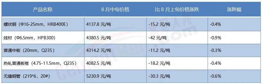 国家统计局24日公布的数据显示,全国流通领域9大类50种重要生产资料市场价格,2022年8月中旬与8月上旬相比,23种产品价格上涨,22种下降,5种持平。水泥人网注意到与水泥相关的钢铁、煤炭等都在下跌。