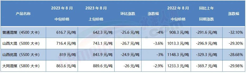 煤价方面,8月中旬各热值煤炭价格同比上年同期,出现了近三成的下跌,全部跌至900元/吨以下。