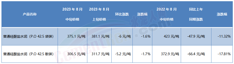 水泥价格方面,8月中旬流通领域P.O42.5散装水泥报价306.5元/吨,较8月上旬下跌了5.2元/吨,跌幅1.7%。同比2022年8月上旬流通领域P.O42.5散装水泥报价372.9元/吨,下跌了66.4元/吨,跌幅17.81%。