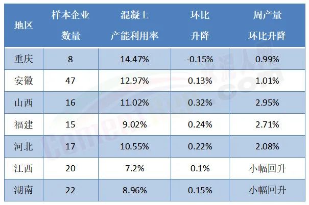 其中,安徽、山西、河北近期天气利好施工,搅拌站恢复正常供应,混凝土发运量出现小幅回升;重庆新开工项目较少,需求不佳,混凝土发运量有所降低;福建市场新增较少,多数已在手订单项目有所开工,因此带来些许新增需求,短期来看,项目工程进度受到资金困扰较大。