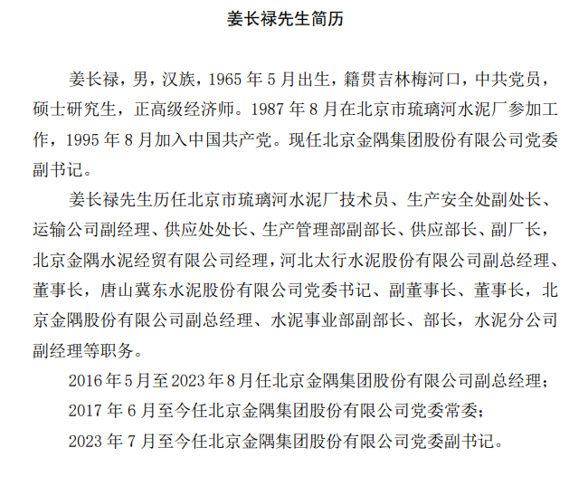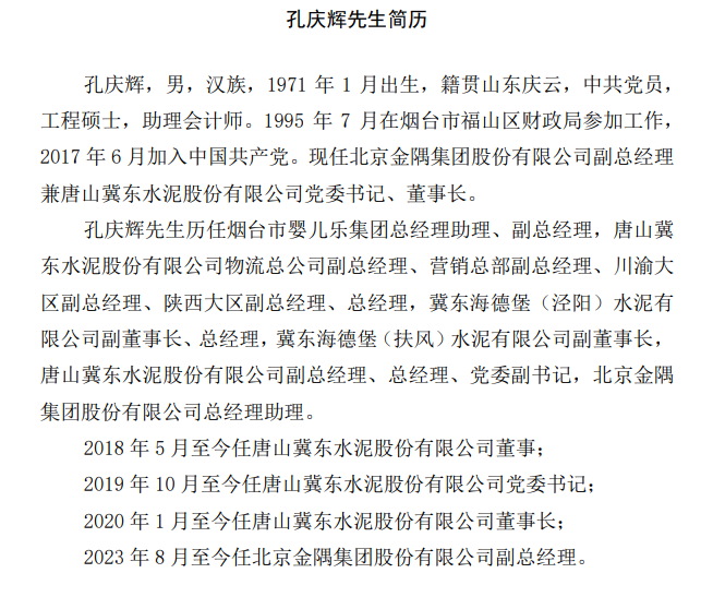 金隅冀东24日晚间公告,提名顾昱先生、姜长禄先生为公司董事候选人。聘任顾昱先生为公司总经理,聘任孔庆辉先生为公司副总经理,任期与本届董事会任期一致,同时孔庆辉先生不再担任公司总经理助理。