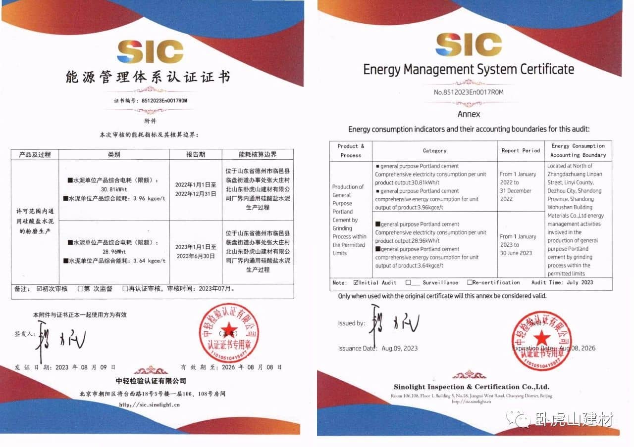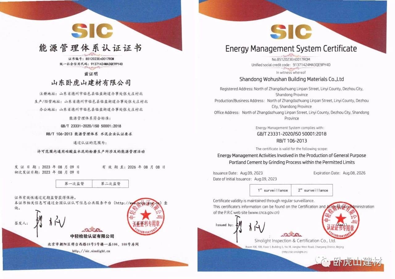 2023年7月19日至23日,中轻检验认证有限公司专家组一行4人,对山东卧虎山建材有限公司进行了能源、质量、环境和职业健康安全管理体系认证审核工作。本次审核主要依据标准为: