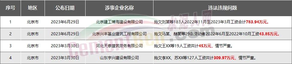 北京市4家房企、建企欠薪被通报或处罚,涉及金额1182.76万元