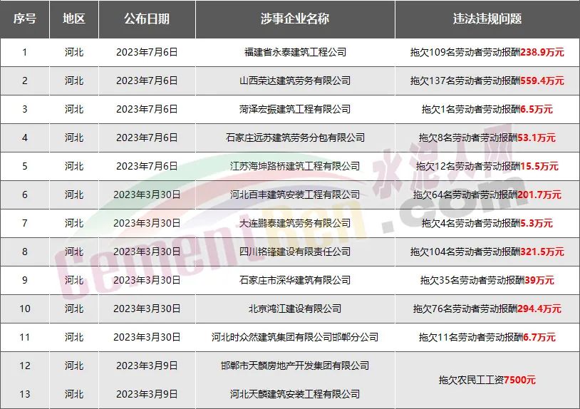 河北省13家房企、建企欠薪被通报或处罚,涉及金额1742万元