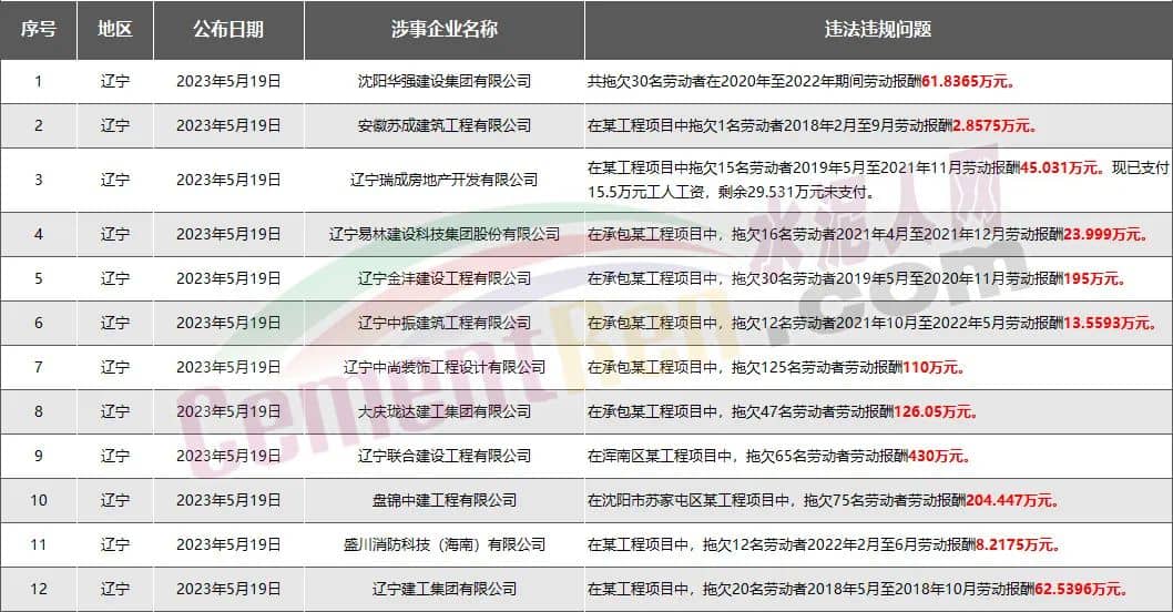 辽宁省12家房企、建企欠薪被通报或处罚,涉及金额1282万元