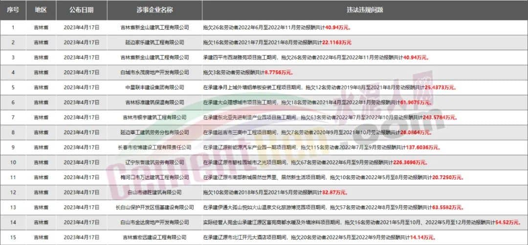 吉林省15家房企、建企欠薪被通报或处罚,涉及金额775.96万元