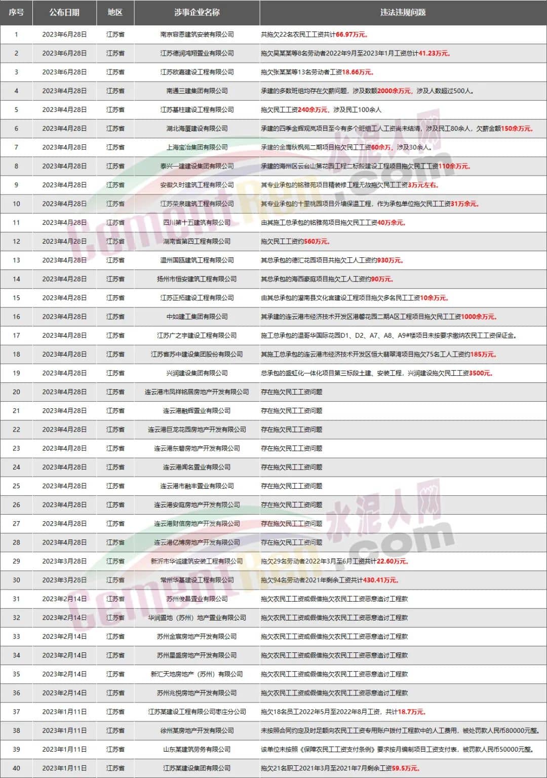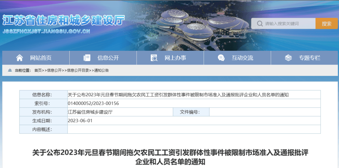 6月1日,江苏省住房和城乡建设厅公开消息,对2023年元旦春节期间因拖欠农民工工资引发群体性事件的126家企业予以全省范围内限制建筑市场准入,对44家企业予以全省通报批评。