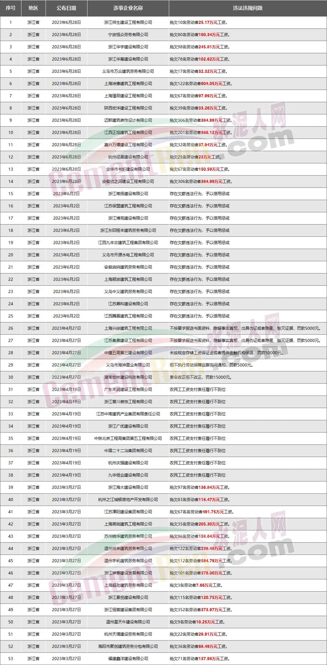 浙江省53家房企、建企欠薪被通报或处罚,涉及金额5752万元