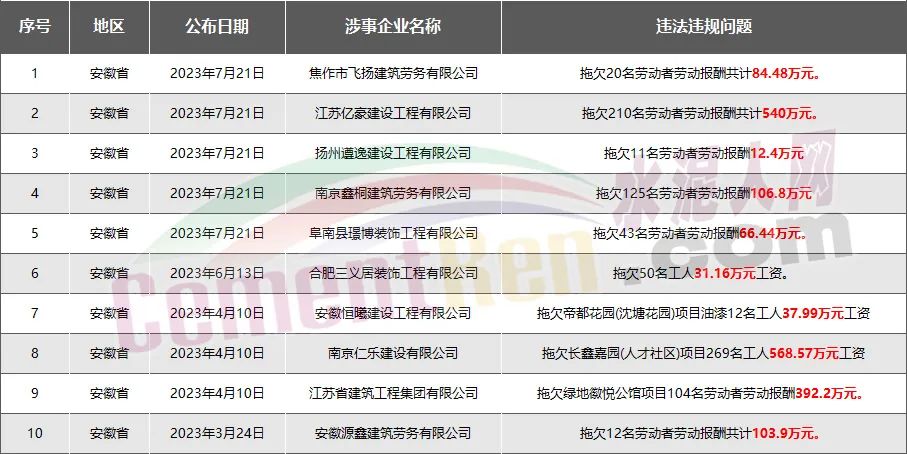 安徽省10家房企、建企欠薪被通报或处罚,涉及金额1944万元