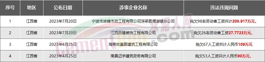 江西省4家房企、建企欠薪被通报或处罚,涉及金额435.68万元