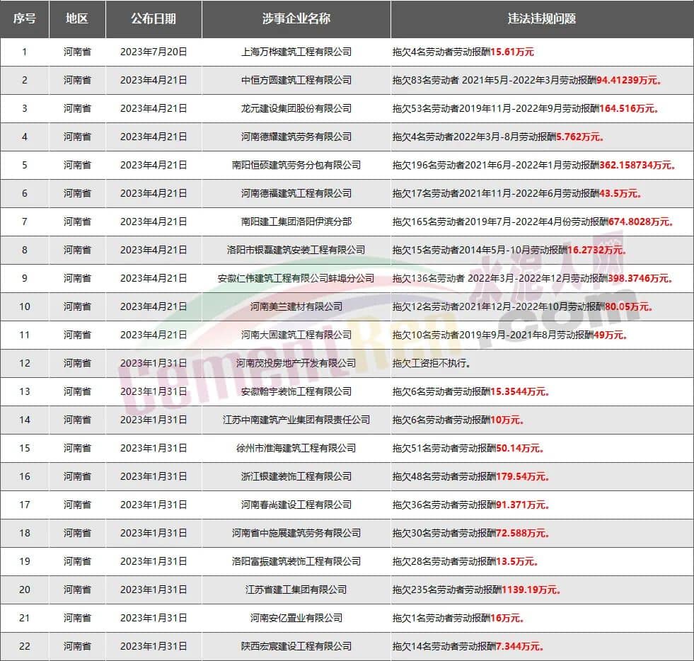 河南省22家房企、建企欠薪被通报或处罚,涉及金额3499.43万元