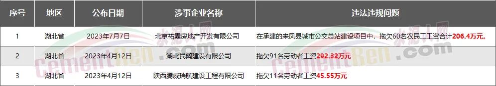 湖北省3家房企、建企欠薪被通报或处罚,涉及金额544.27万元
