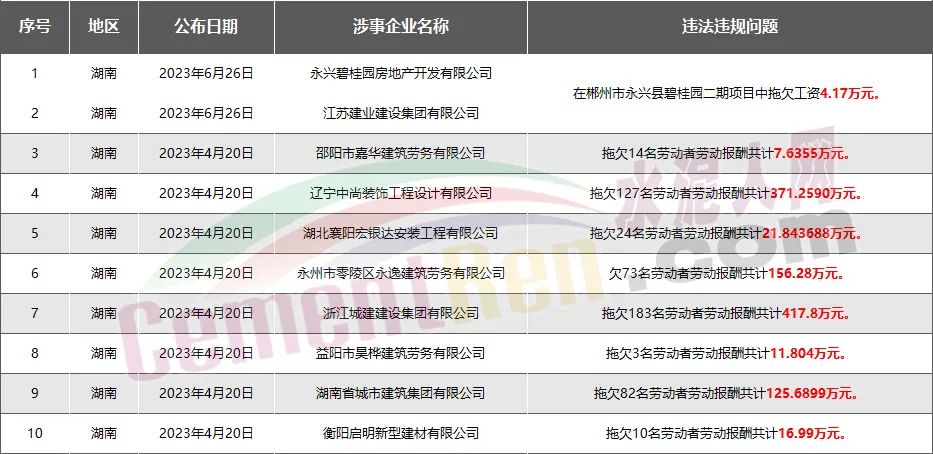 湖南省10家房企、建企欠薪被通报或处罚,涉及金额1133.44万元