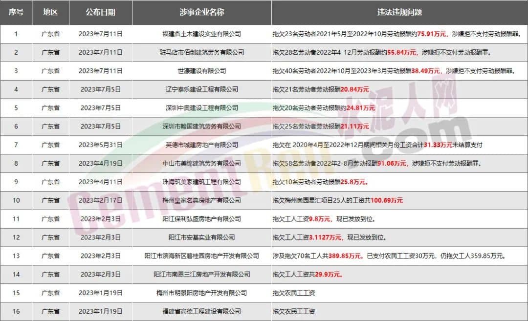 广东省16家房企、建企欠薪被通报或处罚,涉及金额918.51万元