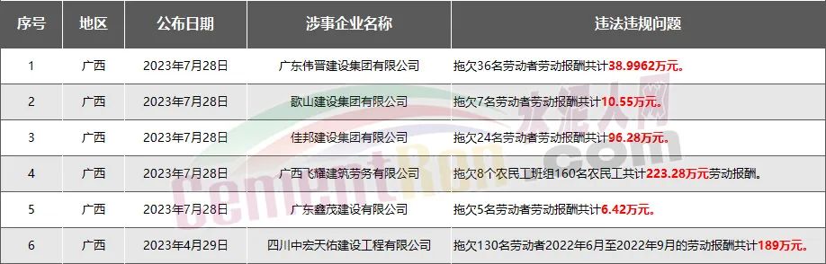 广西6家房企、建企欠薪被通报或处罚,涉及金额564.52万元
