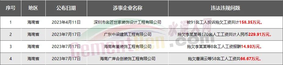 海南省4家房企、建企欠薪被通报或处罚,涉及金额469.86万元