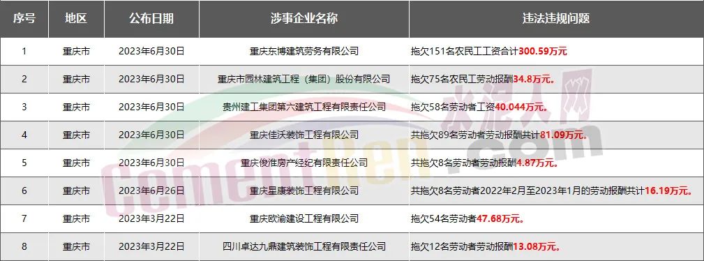 重庆市8家房企、建企欠薪被通报或处罚,涉及金额538.34万元