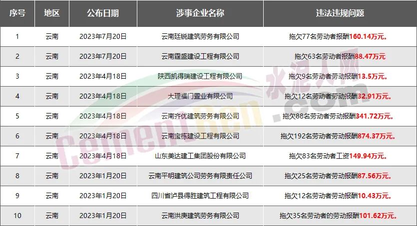 云南省10家房企、建企欠薪被通报或处罚,涉及金额1860.66万元