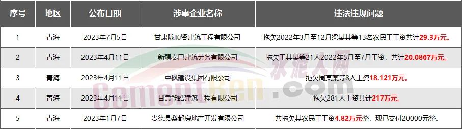 青海省5家房企、建企欠薪被通报或处罚,涉及金额289.32万元