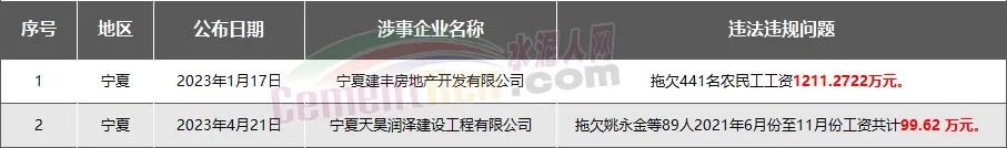 宁夏2家房企、建企欠薪被通报或处罚,涉及金额1310.89万元