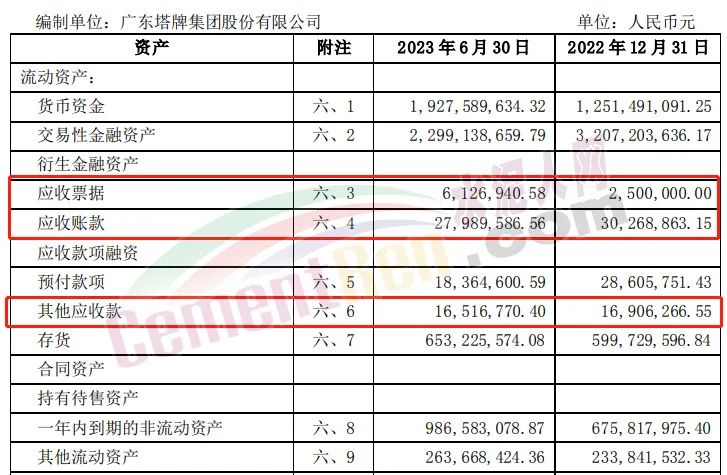 但塔牌集团在业绩大比例上升的同时,应收票据增幅也超预期。塔牌集团2023年半年度财务报告中数据显示,应收票据及应收账款3412万元,同比增长33.18%,其中应收票据612.7万元,同比增长6026.94%,应收账款2799万元,同比增长9.69%。