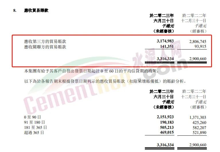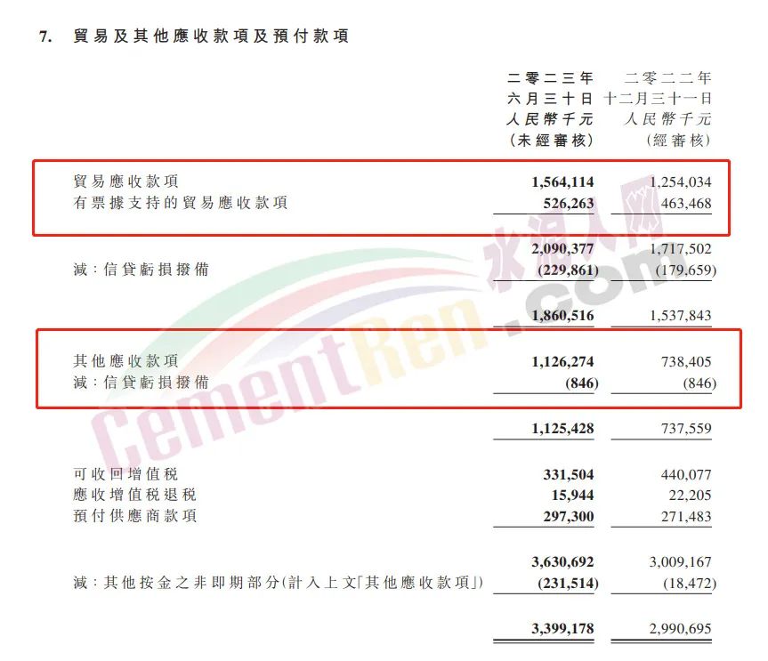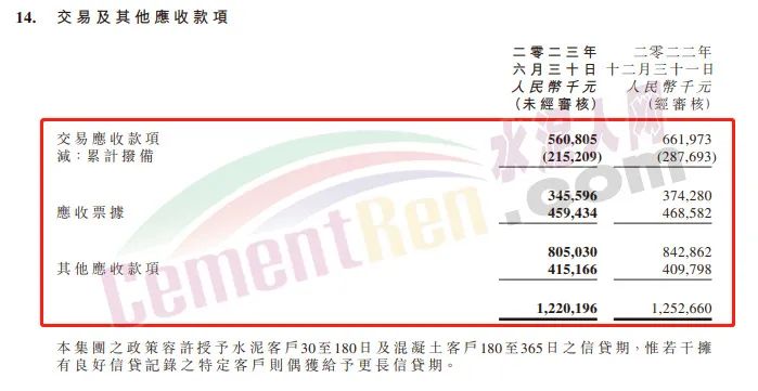 2023年上半年亚洲水泥应收账款5.6亿,应收票据8.05亿,其他应收款12.2亿。