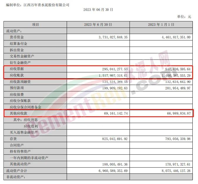 2023年上半年万年青应收账款15.18亿,应收票据2.95亿,其他应收款0.69亿。