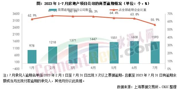 水泥企业这些票据账款中有多少是房地产企业的,我们无从得知,但是看看房地产行业的情况就能发现,情况不容乐观。据票交所公布的《截至2023年7月31日承兑人逾期名单》,2023年2月末到7月末发生3次以上商票逾期,且月末有逾期余额或当月出现票据逾期行为的房地产项目公司数量1593个,占全部商票逾期企业的比重为55.9%。