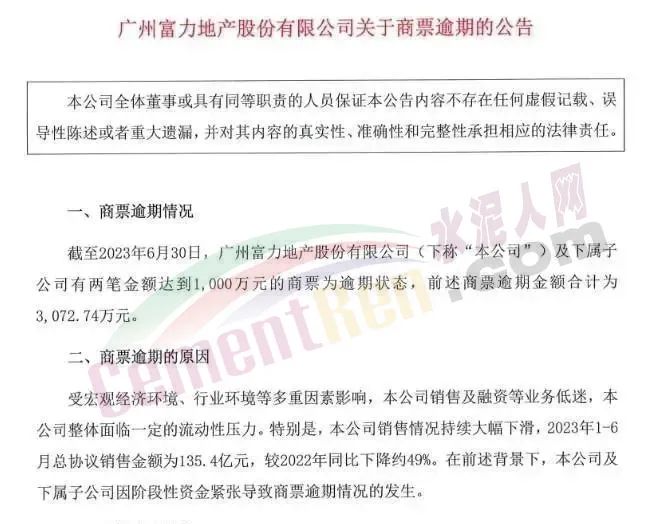 截至6月30日,广州富力及下属子公司有两笔金额达到1000万元的商票为逾期状态,前述商票逾期金额合计为3072.74万元。此前,富力地产由于商票逾期,被债权人广东祥正商贸有限公司、广州市广丰混凝土有限公司以“不能清偿到期债务且明显缺乏清偿能力”申请破产重整。